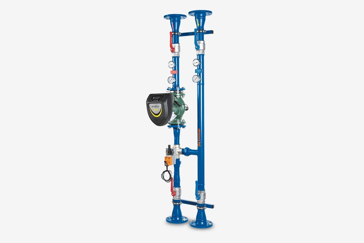 To supply houses of different sizes, the 3-way mixing group is available with 150 kW, 300 kW and 600 kW. The temperature difference between flow and return is 20 K. The mixing group can be shut off entirely by means of four ball valves.