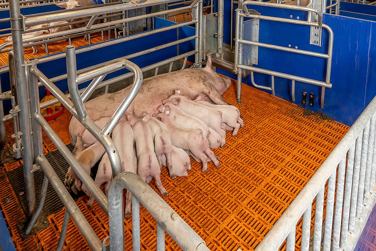 Mehr Schutz für Ferkel, mehr Platz für die Sau: Die Big Dutchman-Bewegungsbucht ActiWel kombiniert Ferkelschutzkorb, beheiztes Ferkelnest und Bewegungsfreiheit in einer cleveren Bucht.