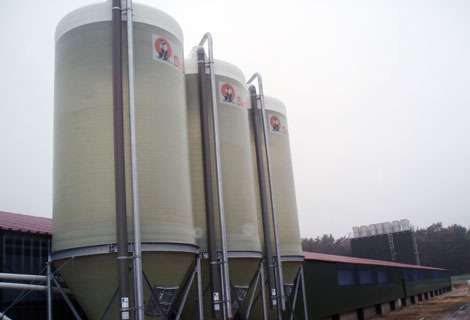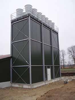 Свежий воздух поступает в помещение через приточные клапаны боковых стен птичника. В конце здания фермеры предусмотрели вытяжную башню высотой 12 метров, в которую встроены 14 каминов, соблюдая тем самым норму по строительству птичников, предписывающую удаление отработанного воздуха со скоростью 7м/с.
