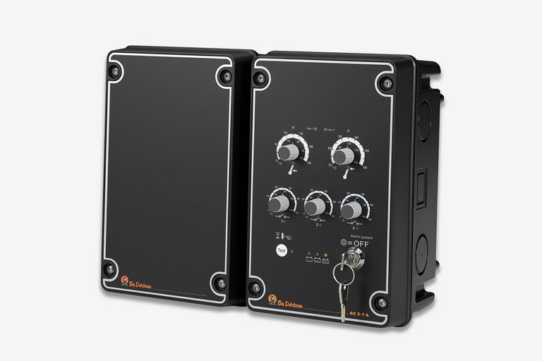 Прибор имеет два корпуса, а панель управления при монтаже в дверцу распредшкафа занимает мало места. Второй корпус для батарейки и реле контроля фаз (опция) может быть размещен в распредшкафу. Все важные функции наглядно отображены и отличаются простотой эксплуатации. Для корпуса с батарейкой к тому же предусмотрено удаление воздуха. AC 3-T работает абсолютно автономно и потому не имеет возможности совершать обмен данными с системой менеджмента BFN Fusion либо BigFarmNet.