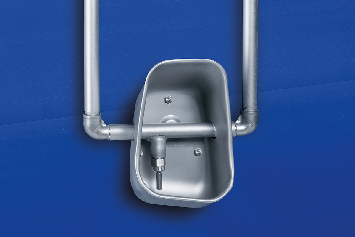 - Чашечная поилка из эмалированного чугуна для одновременного использования свиноматками и поросятами в боксе опороса.