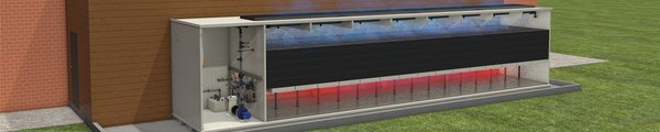 A pressure corridor, which must be provided by the customer, connects the Porcus air scrubber with the barn. Fans press the exhaust air into this corridor and then into the scrubber itself. In the scrubber, the air flows upwards through a horizontal filter bed.
