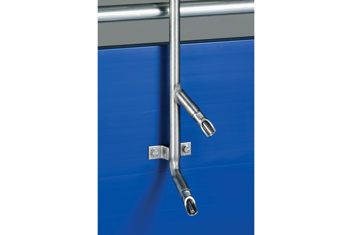 Управляя электромагнитными клапанами, установленными между главной и вспомогательной линиями, интервалы распыления и паузы системы замачивания можно регулировать индивидуально, в зависимости от степени загрязнения. В распоряжении имеются форсунки на 360°или 180°. Гибкая подвеска системы замачивания предотвращает повреждения струей воды из моющего аппарата высокого давления. Система может быть легко адаптирована к тем или иным размерам животноводческого помещения.