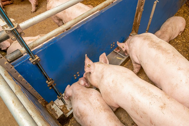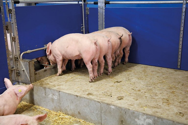 The aim is keeping the pigs’ metabolism balanced to prevent unnecessarily high water intake. Feed and water are only available on a raised platform (0.25 cm for piglets and 0.50 cm in two steps for finishing pigs).