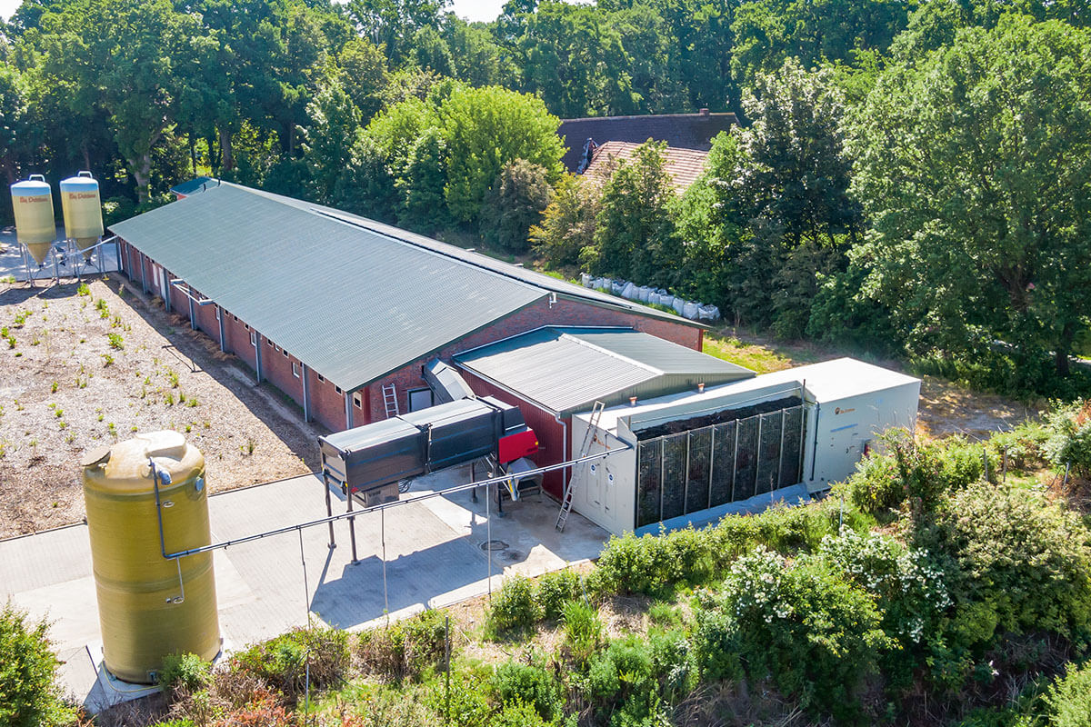 The exhaust air can be extracted either individually through exhaust air chimneys on the roof or centrally at the gable. Depending on the relevant regulations, an air scrubber may be necessary. The fin heater is the ideal heating system. Its ribbed tubes are installed below the wall or ceiling inlets to save space. The incoming fresh air can thus be heated very efficiently, whenever necessary.