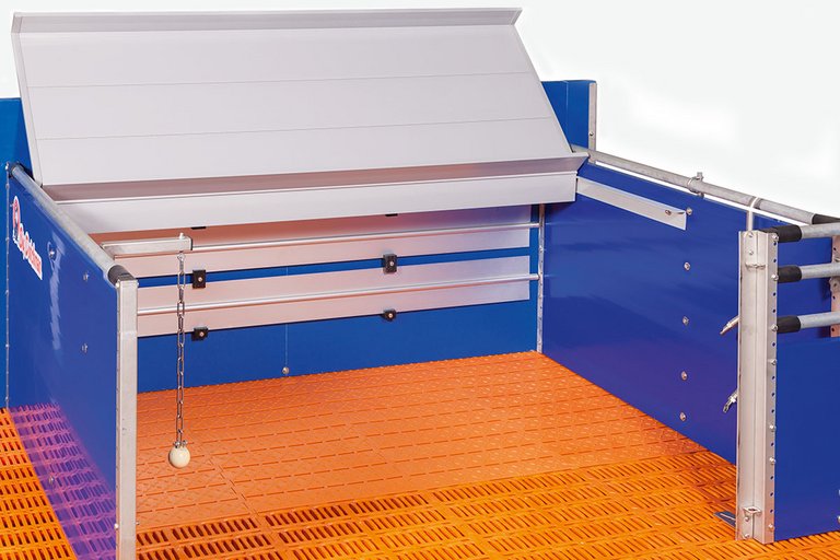 Отогнутая кромка фронтальной части крышки шириной 20 см способствует образованию тепловой подушки. Непосредственно под крышкой размещается система отопления (трубы Twin). Данная система позволяет прежде всего прогревать зону отдыха поросят на фоне более низких температур на остальных участках секции, что позволяет экономить затраты на отопление.