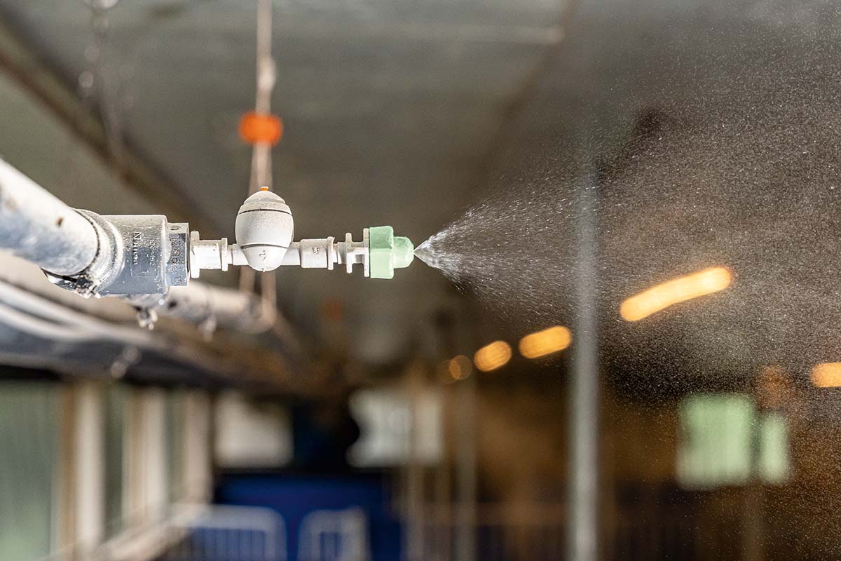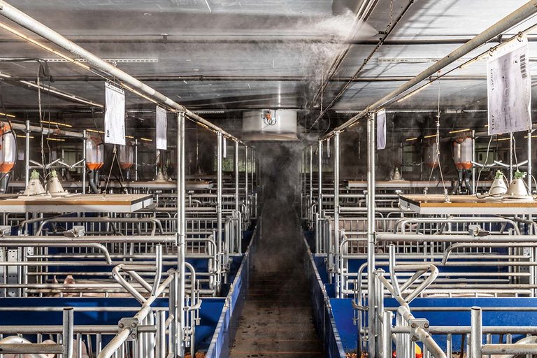 Наша система охлаждения среднего давления может использоваться в больших секциях или моноблоках. По сравнению с охлаждением высокого давления (70 бар) оно работает при давлении всего 4 бара. Распыляется мелкий водяной туман, который снижает температуру воздуха в животноводческом помещении, но не испаряется без остатка.