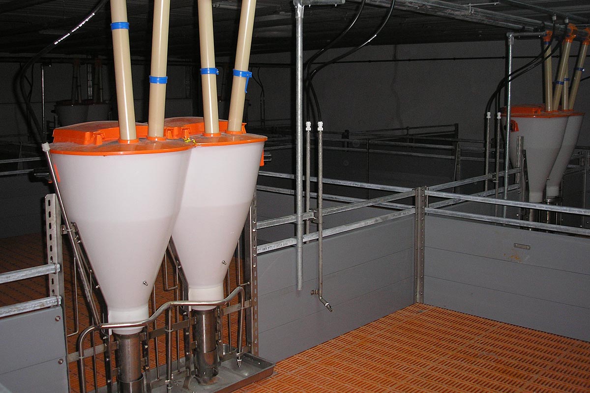 Кормление свиней автоматизировано. Возле свинарников размещены бункеры для комбикорма, из которых он через приемные горловины попадает в спиральные транспортеры, а из них - в систему цепно-шайбовых транспортеров, откуда распределяется по дозаторам, кормушкам и кормовым автоматам. Так, кормление свиноматок, ремонтных свинок и хряков производится через объемные дозаторы. На доращивании и откорме применяют кормовые автоматы типа PigNic и MultiMax.