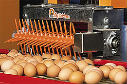 Новый способ передачи яиц на поперечный транспортер с помощью т.н. «пальцевого» колеса обеспечивает сохранность яиц при изменении направления транспортировки. В момент изменения направления между яйцами, выкатывающимся из элеватора, и яйцами, поступающими на поперечный транспортер, всегда находятся несколько «пальцев». Для оптимальных результатов здесь также используются самые современные детали из 2-х компонентов.