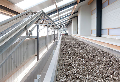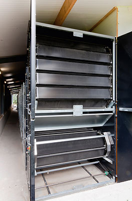 Пластинчатая сушильная установка была разработана в тесном сотрудничестве с голландской фирмой AMP Technoworks. Наиболее ярким внешним отличительным признаком сушилки является ее компактность, позволяющая устанавливать ее даже со стороны фронтона. «Компактная конструкция пластинчатой сушилки OptiPlate по сравнению с ленточными моделями обусловлена более высоким тяговым усилием пластин», - объясняет Йос Ферхегген, сотрудник AMP Technoworks. Длина установки составляет менее 24 метров.В то же время, сушилка обладает большой емкостью: толщина помета на перфорированных пластинах может составлять до 20 см. Свежий помет высушивается с помощью воздуха из птичника за три дня до 90-процентного содержания сухого вещества.
