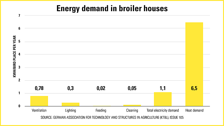 Здесь действует принцип: больше всего электроэнергии потребляет вентиляция, а фермеры, в свою очередь, используют большую часть энергии на обеспечение комфортной температуры своим животным в птичниках (рис. 1). В выпуске KTBL (Попечительский совет по вопросам техники и строительству в сельском хозяйстве) № 105 (Энергопотребление в свиноводстве и птицеводстве, 2014 г.) предполагается расход 6,5 кВт⋅ч на одно животное в год.