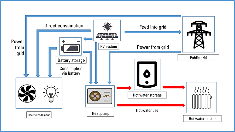 Следующий сценарий будущего показывает, как можно полностью отказаться от традиционных энергоносителей (рис. 10). Птичник отапливается водяными конвекторами. Подача горячей воды целиком производится тепловым насосом. В зависимости от доступности, электроэнергия, необходимая для приведение в действие теплового насоса, поступает от фотогальванической энергетической установки, аккумулятора или через электросеть общего пользования.