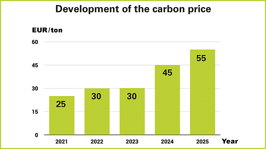 В связи с этим желательно следить за динамикой цен на CO2 (рис. 8): частью немецкого климатического пакета является Закон о торговле квотами на выбросы от сжигания топлива (BEHG), в котором установлены цены на CO2 для традиционного топлива, такого как природный газ и дизель. Цена на CO2 в январе 2021 года первоначально составляла 25 евро за тонну, с тех пор она поэтапно растет и в 2025 году достигнет 55 евро.