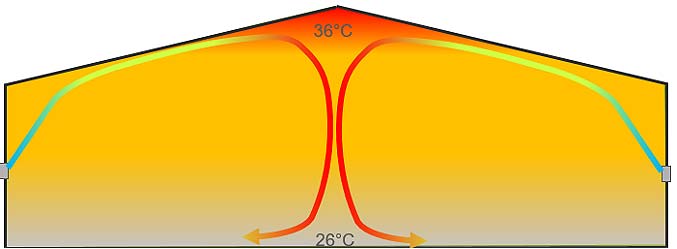 Свежий воздух должен поступать равномерно и одновременно, смешиваясь с теплым воздухом птичника через обширное завихрение воздуха (рис. 2). Здесь может оказаться полезным использование циркуляционных вентиляторов, позволяющих избежать расслоения воздуха, а также эффективно использовать тепло, выделяемое животными, особенно при очень низкой интенсивности вентиляции.