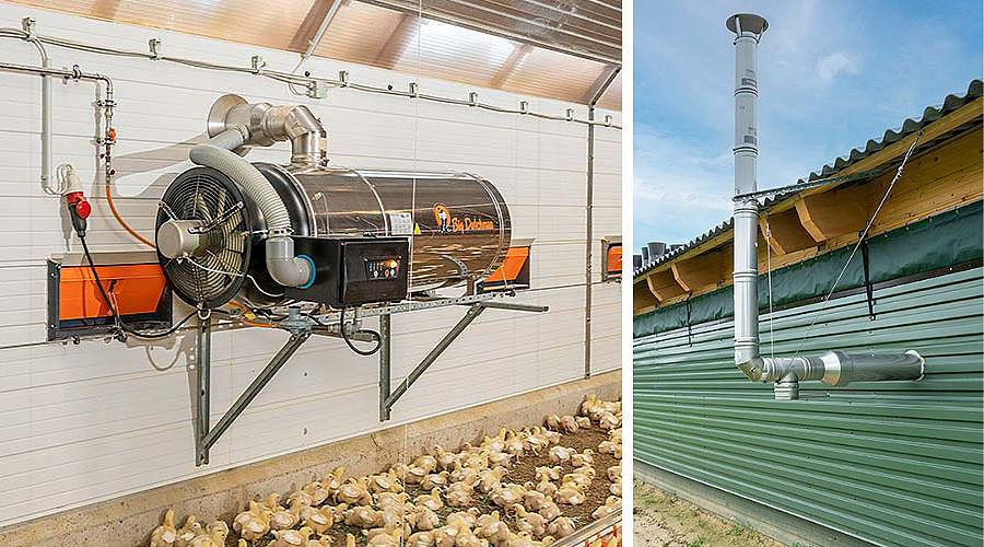 При открытым типе сгорания тепловая энергия сгораемого газа направляется вместе с горячими отработанными газами в птичник. Например, для такого топлива, как пропан, это 150 г водяного пара и 230 г CO2 на киловатт установленной отопительной мощности в час. Хотя эти приборы обладают 100%-ным КПД, отработанные газы и водяной пар требуют значительно большей вентиляции.