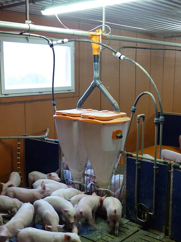 Заселение животных в корпус для доращивания производится по мере того, как их вес достиг 7 кг. Поросят с весом 45 кг переводят в помещение откорма. На доращивании установлены кормоавтоматы PigNic-Jumbo фирмы Big Dutchman, в которые поступают преимущественно региональные корма: около 95% кормов свиновод производит сам и лишь оставшиеся 5% приходятся на долю закупаемых специальных премиксов и витаминов.