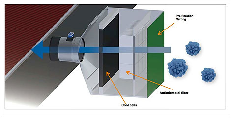 В каждом фильтрующем модуле очистка воздуха производится в три этапа: на первом этапе воздух проходит через ветрозащитную сетку или решетку, предотвращающую попадание крупных частиц грязи в очистительный блок. На втором этапе воздух пропускается через антибактериальный фильтрующий материал, способный отфильтровывать даже мельчайшие частицы, такие, как, например, вирус РРСС. В заключение очищенный воздух попадает в парообразующую систему охлаждения, которая, если необходимо, уменьшает его температуру.