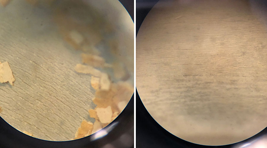 Вид под микроскопом (рис. 4) подтверждает подозрение: на шланге из ПВХ обнаружены многочисленные микротрещины. Тщательная чистка и дезинфекция поверхностей с такой структурой практически невозможна. Трещины представляют для микробов идеально защищенную среду обитания, свободную от движения воды.