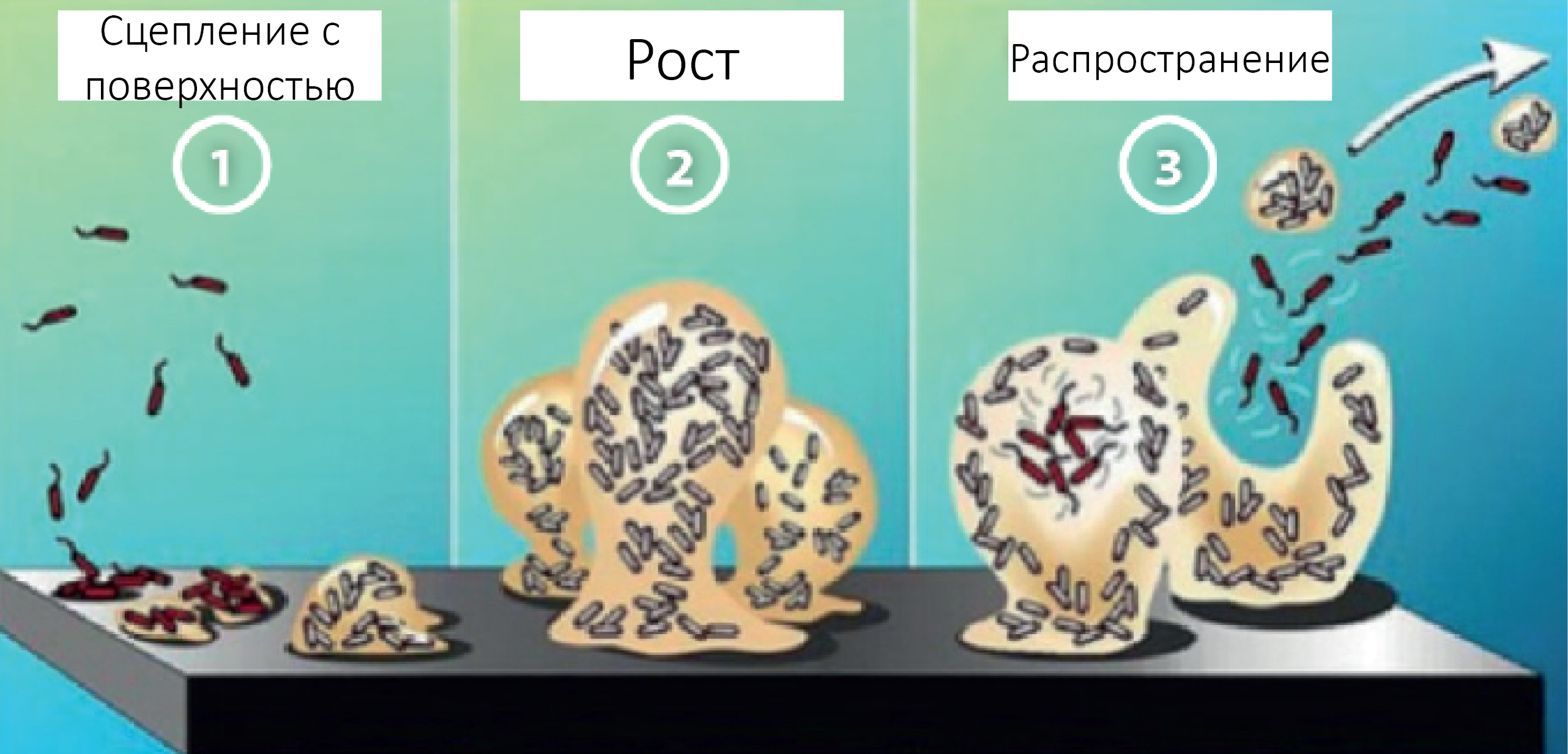 В течение нескольких минут микроорганизмы сцепляются с поверхностями, находящимися в воде. Продукты метаболизма микробов выделяются на внеклеточных участках, делая возможным образование трехмерной структуры. Происходит высвобождение микроорганизмов, которые оседают уже на других участках. Данный процесс может продолжаться сколь угодно долго, способствуя распространению микробов в водопроводной системе (рис. 1).